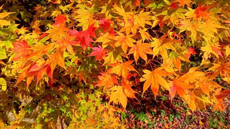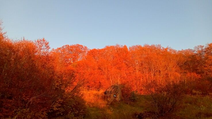 紅葉が夕日を浴びて更に赤くなっています。
