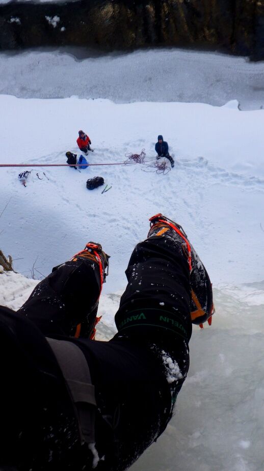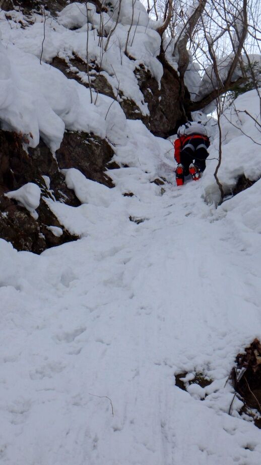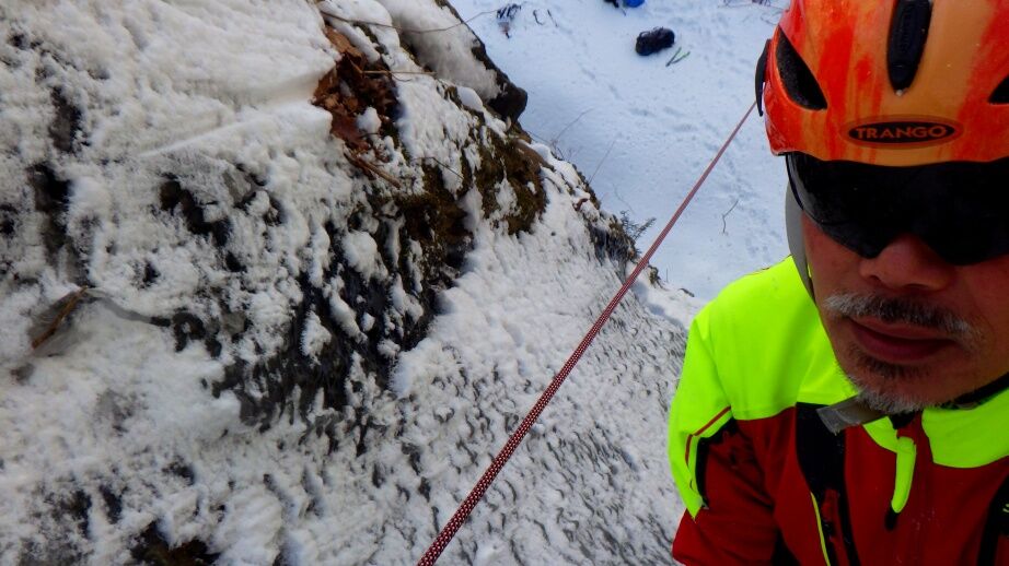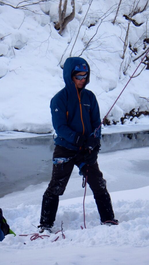 ここから懸垂下降して沢に降りるのですが雪が多いので今日はクライムダウンにしました。