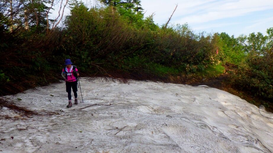 雪渓を歩いて登山道へ。